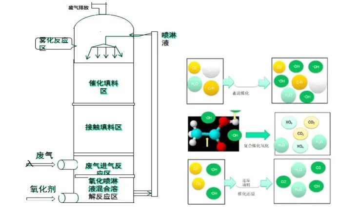 多相催化氧化技术是利用特殊催化剂激发复配氧化剂产生大量的超氧自由基和羟基自由基,以此破坏恶臭因子及有机物的化学键,将其分解为CO2和H2O等。废气在反应器内从下往上流动的过程中,在催化填料内同从反应器顶部喷淋而下的复配氧化剂及在催化填料表面产生的羟基自由基和超氧自由基接触,将废气中的恶臭因子及有机物氧化分解后排出。