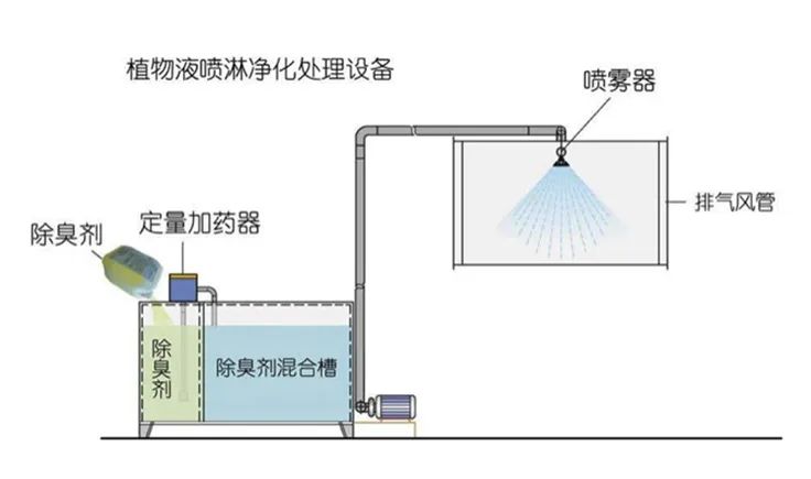 植物液喷淋除臭是运用不同的湿法喷洒技术经专用喷雾机喷洒成雾状,在特定的空间内扩散液滴。在液滴中的有效除臭分子中间含有具有生物活性、化学活性、共轭双键等活性基团,可以与不同的异味发生作用。